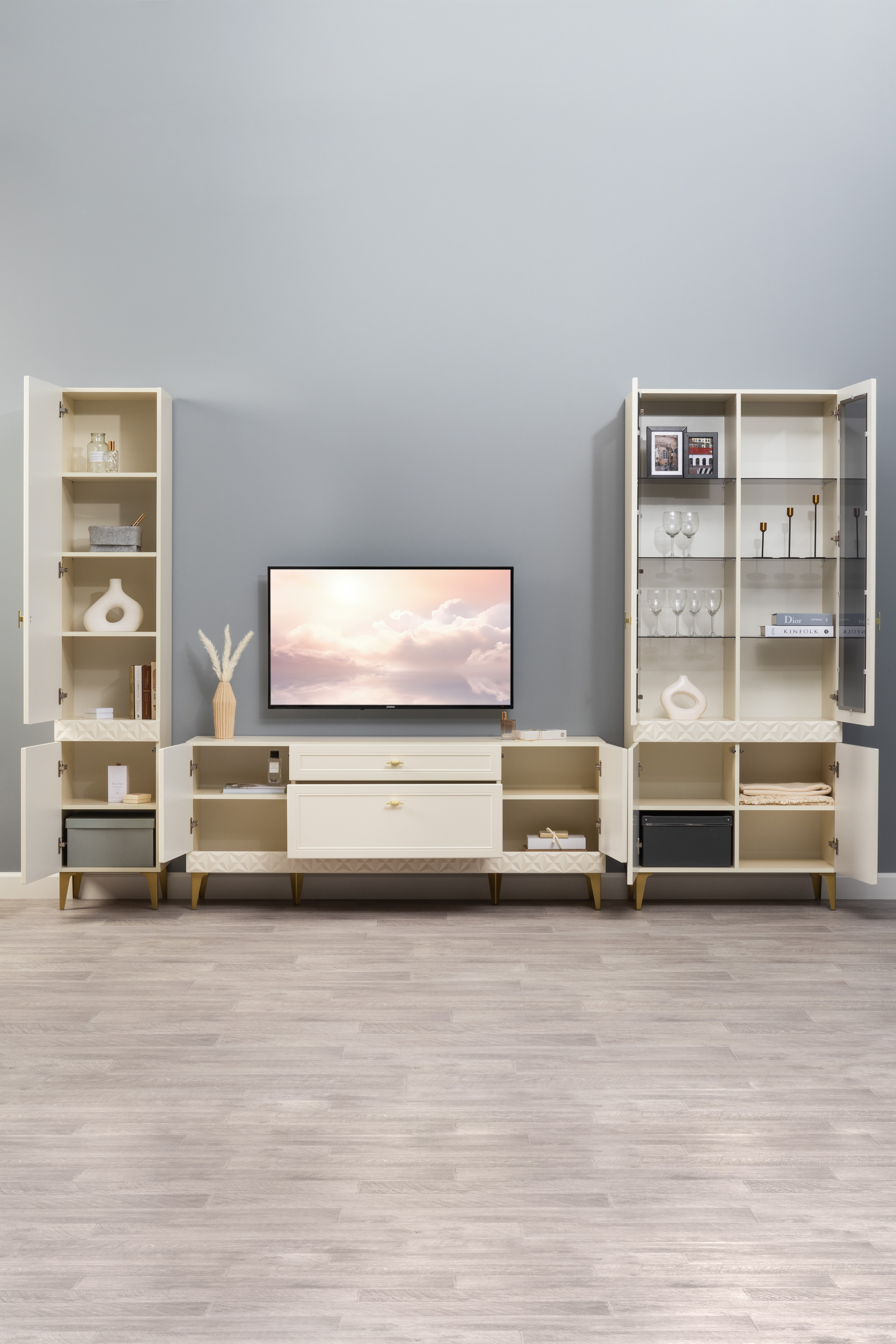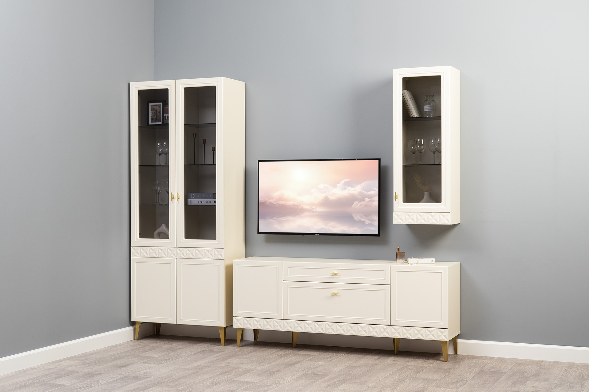 Гостиная Марион композиция 3 слоновая кость С341 PE, слоновая кость 6898 ПВХ, белый PE шагрень (собирается на любую сторону)