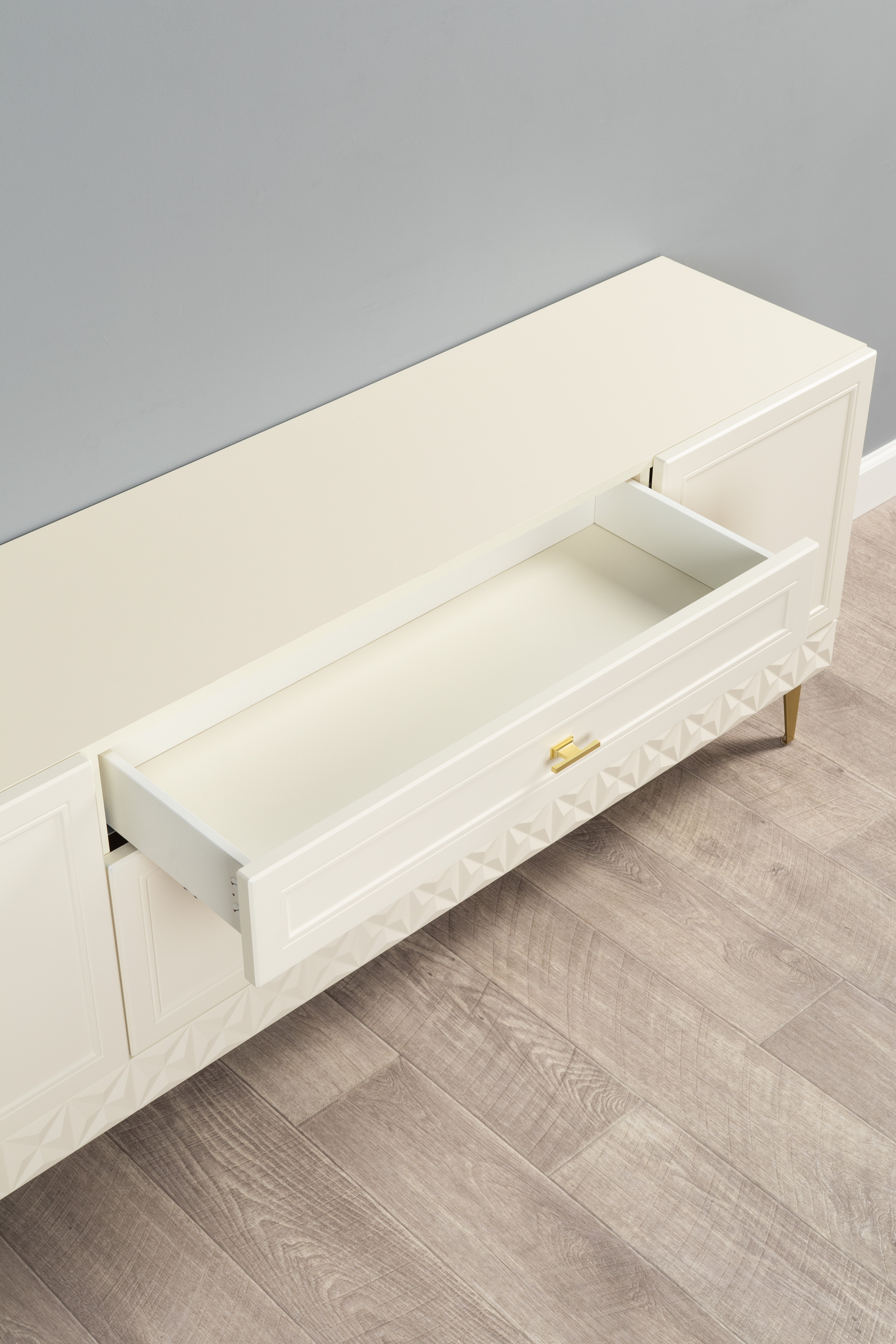 Изящные линии, глубокая фрезеровка фасадов из МДФ и благородные оттенки. Утончённая «Слоновая кость» и изысканная «Олива Шагрень» с глубоким зелёным тоном — создают атмосферу уюта, тепла и благородства. Металлические ручки и опоры золотого цвета придают мебели утончённый блеск, а петли и направляющие с доводчиками обеспечивают плавное и бесшумное закрытие фасадов.