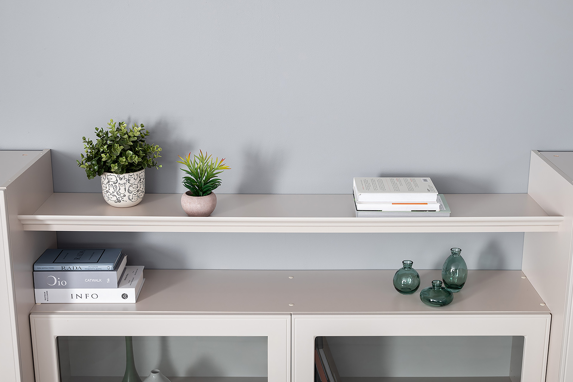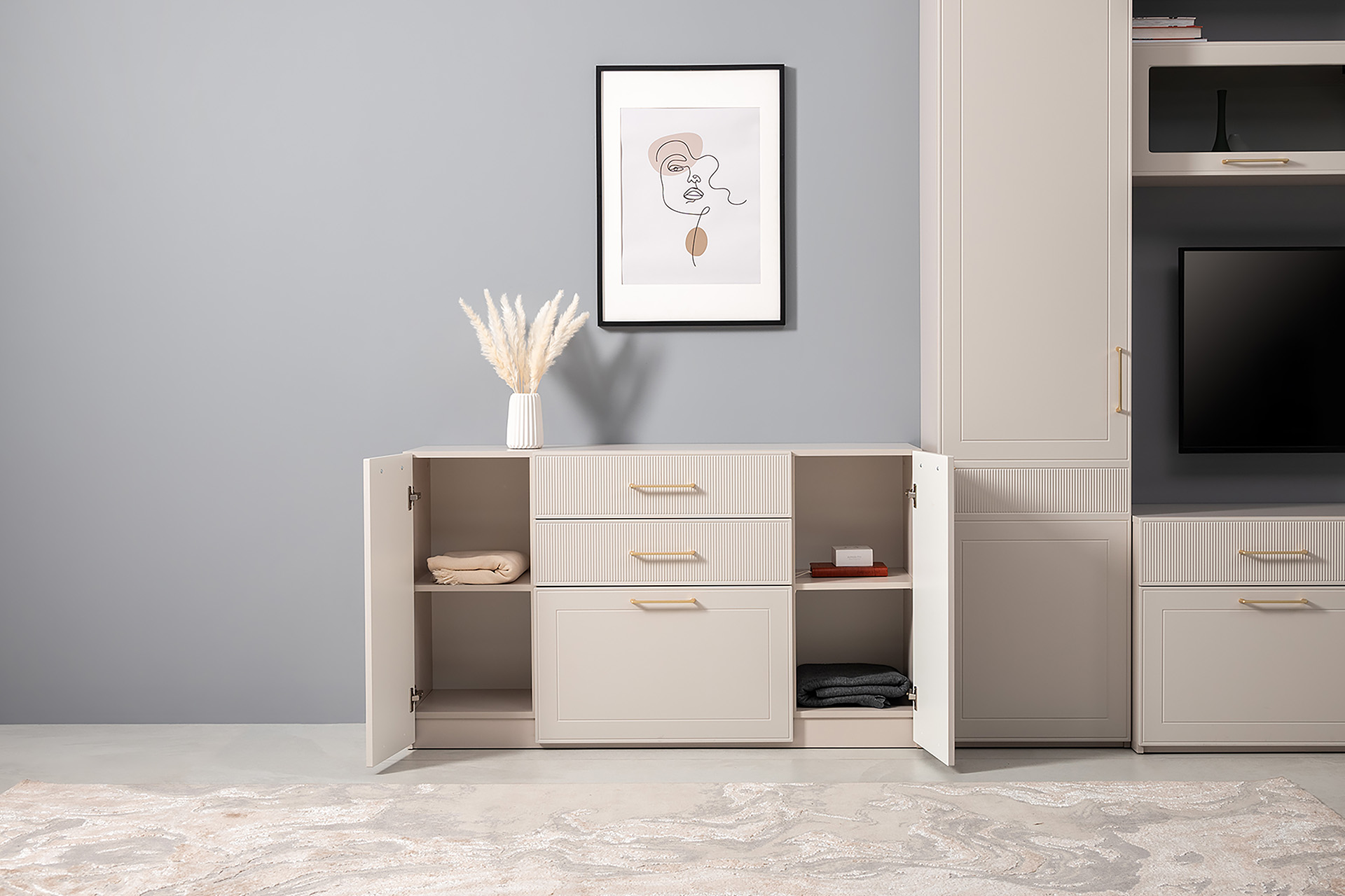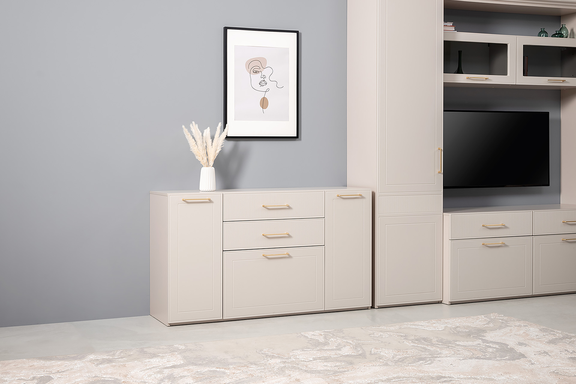 Гостиная Ричфорд композиция 2 без карнизов, кашемир 5981 BS, моно керамика D166-2 ПВХ, белый PE шагрень (собирается на любую сторону)
