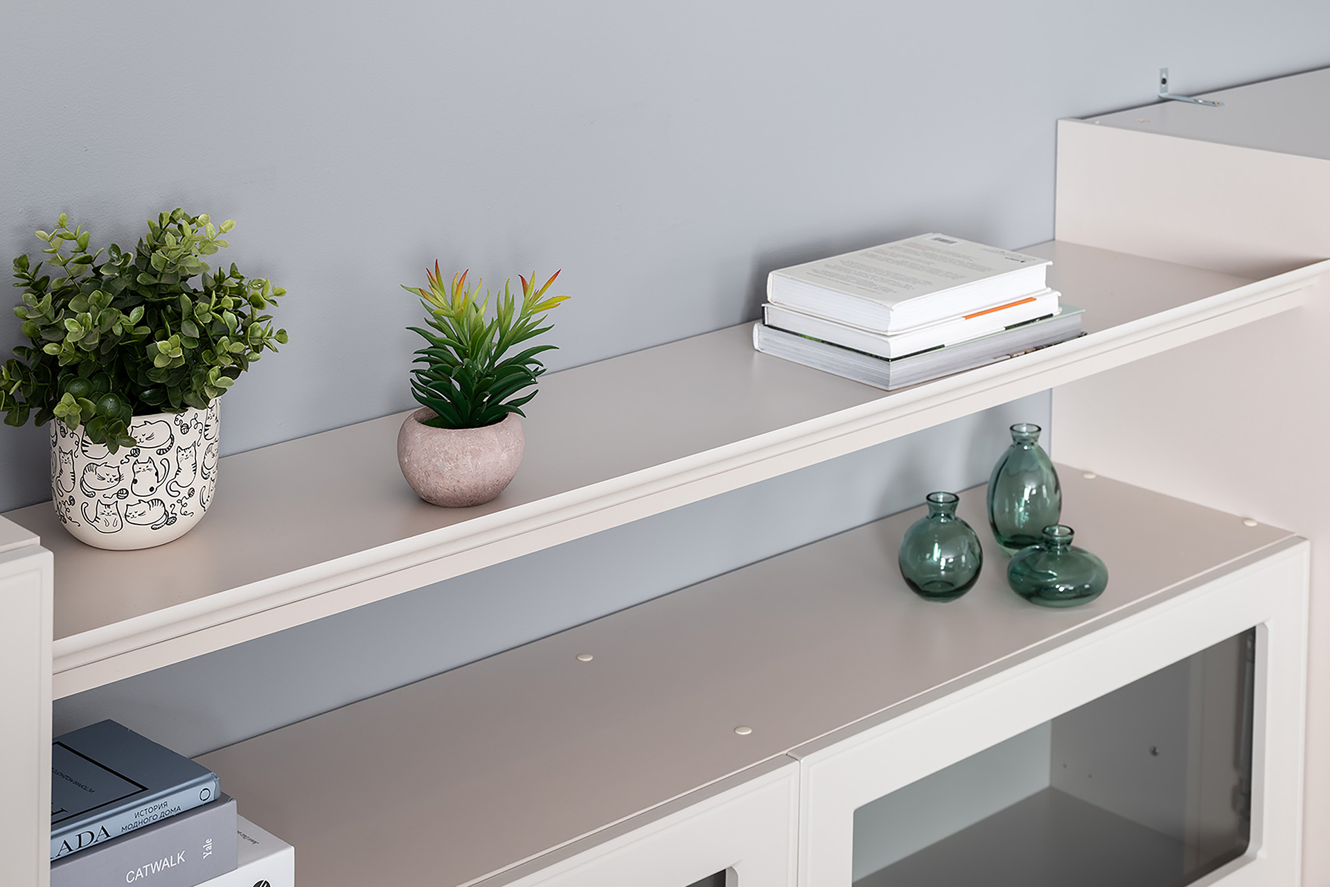 Фрезерованные фасады из МДФ, металлические ручки и витрины с тонированным стеклом создают изысканный образ.
