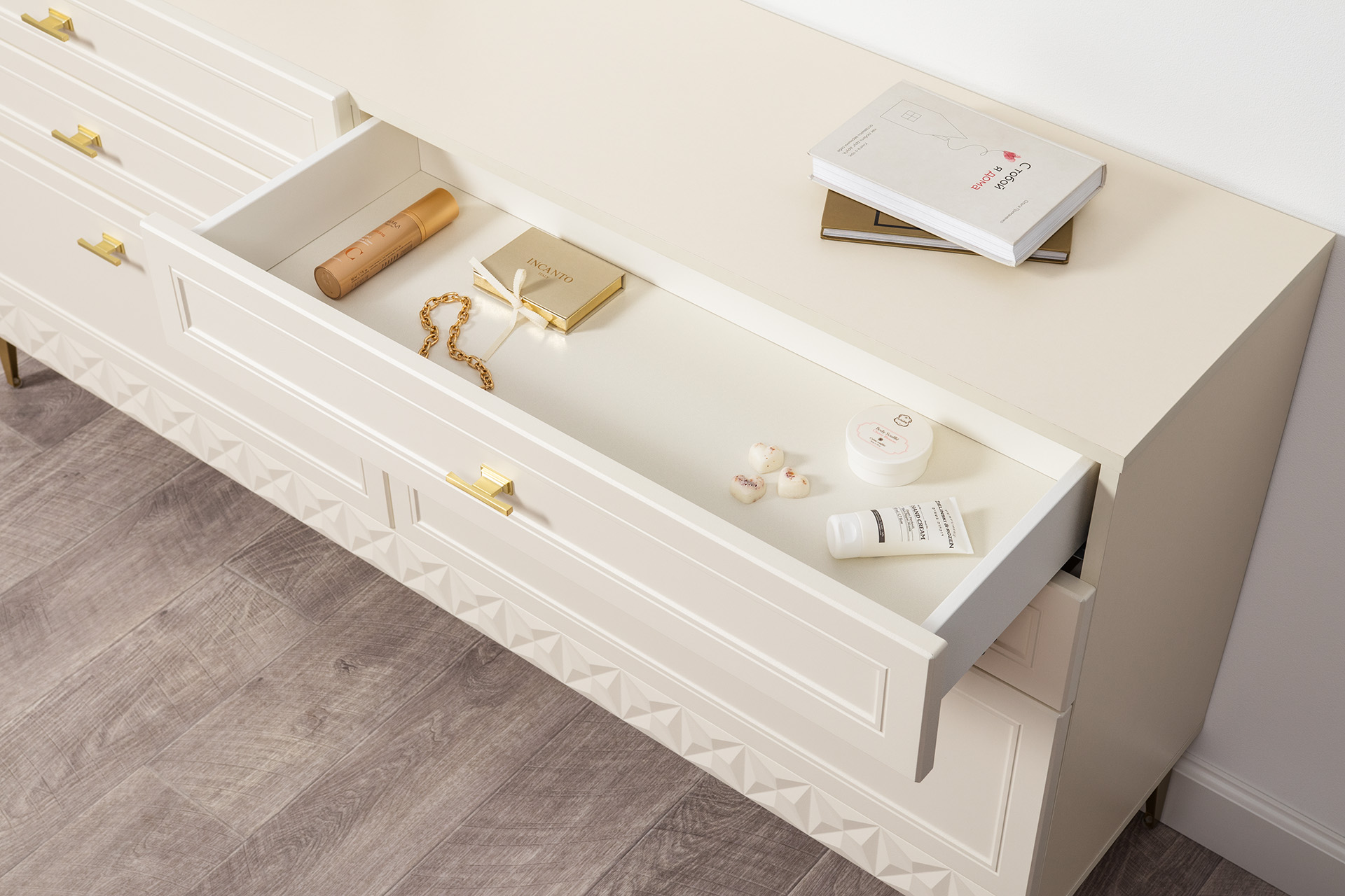 Комод Бостон 13.115 дуб эндгрейн элегантный, милк рикамо софт ПВХ