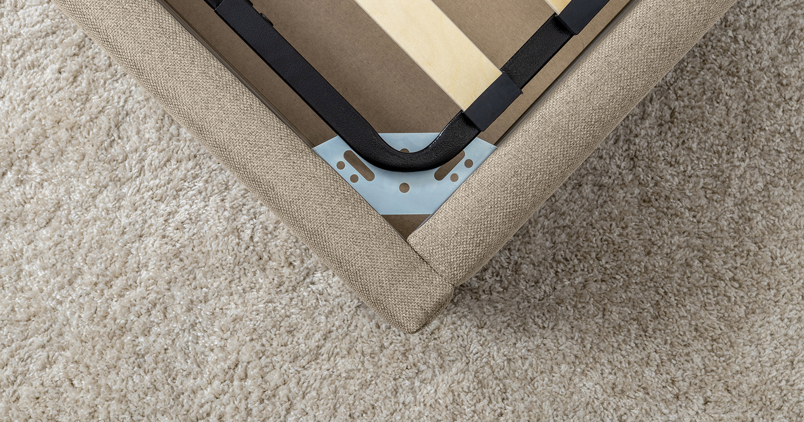 Основание кровати укомплектовано матрасодержателями. Жесткое кроватное дно из МДФ 6 мм. Задняя стенка изголовья выполнена в тех. ткани (спанбонд).