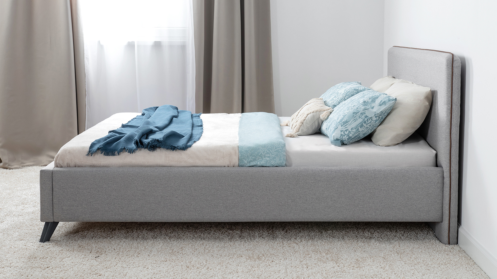 Основание кровати укомплектовано матрасодержателями. Жесткое кроватное дно из МДФ 6 мм. Задняя стенка изголовья выполнена в тех. ткани (спанбонд).