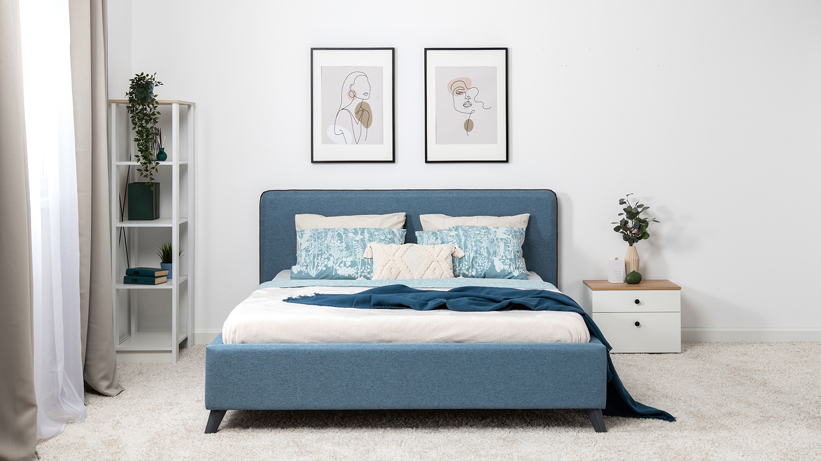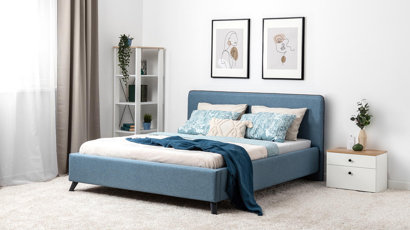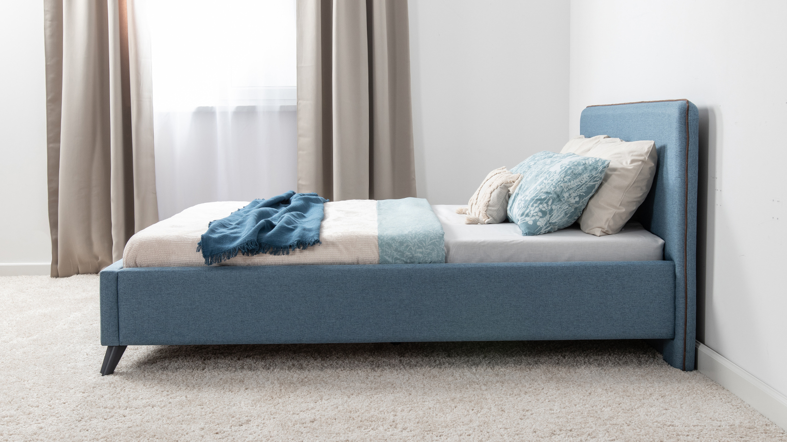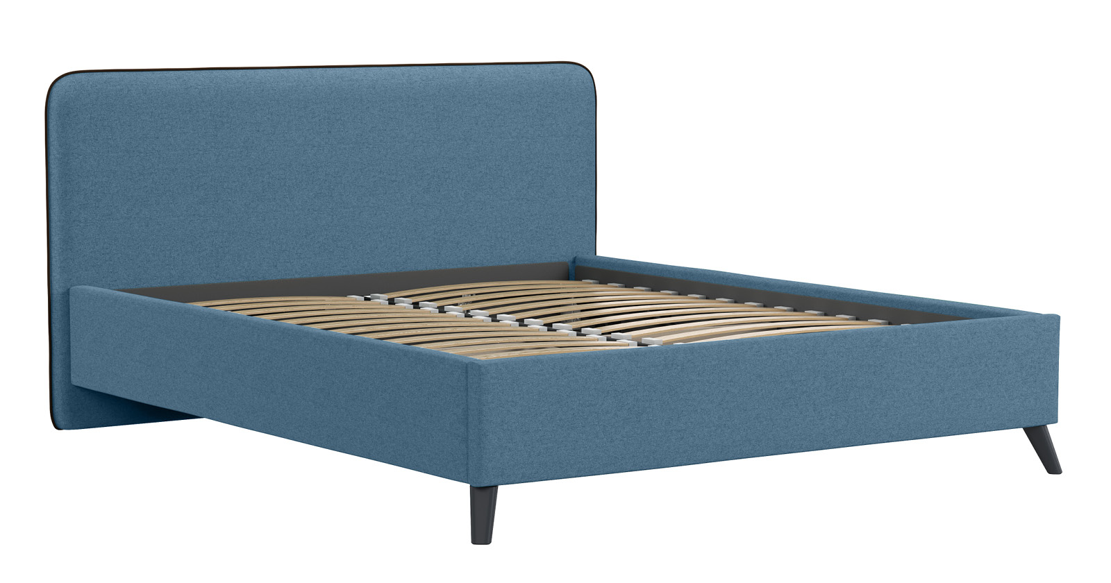 Кровать Миа 160 рогожка светло-синий, кант желтовато-коричневый с ортопедическим основанием и подъемным механизмом
