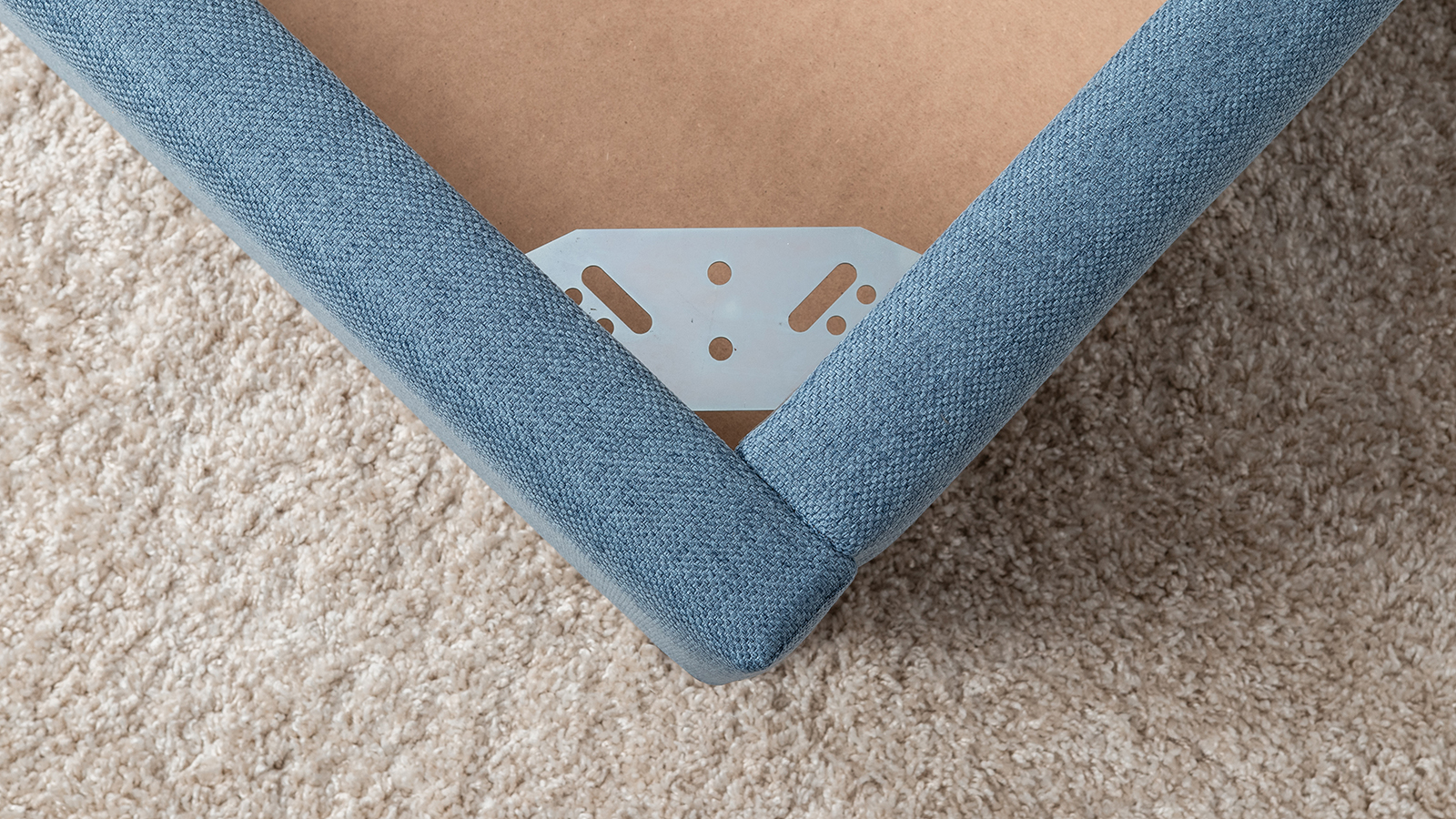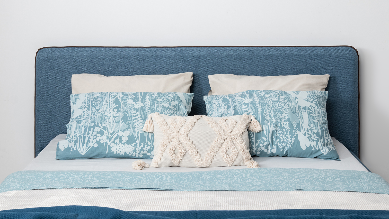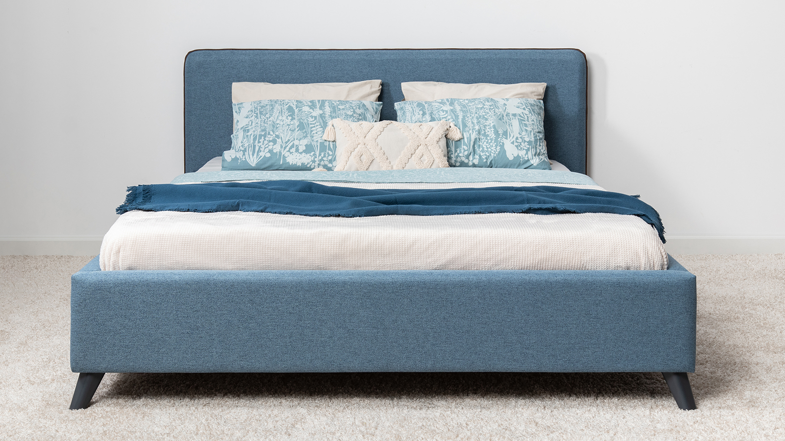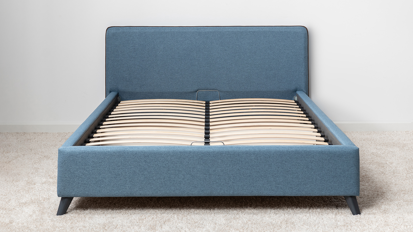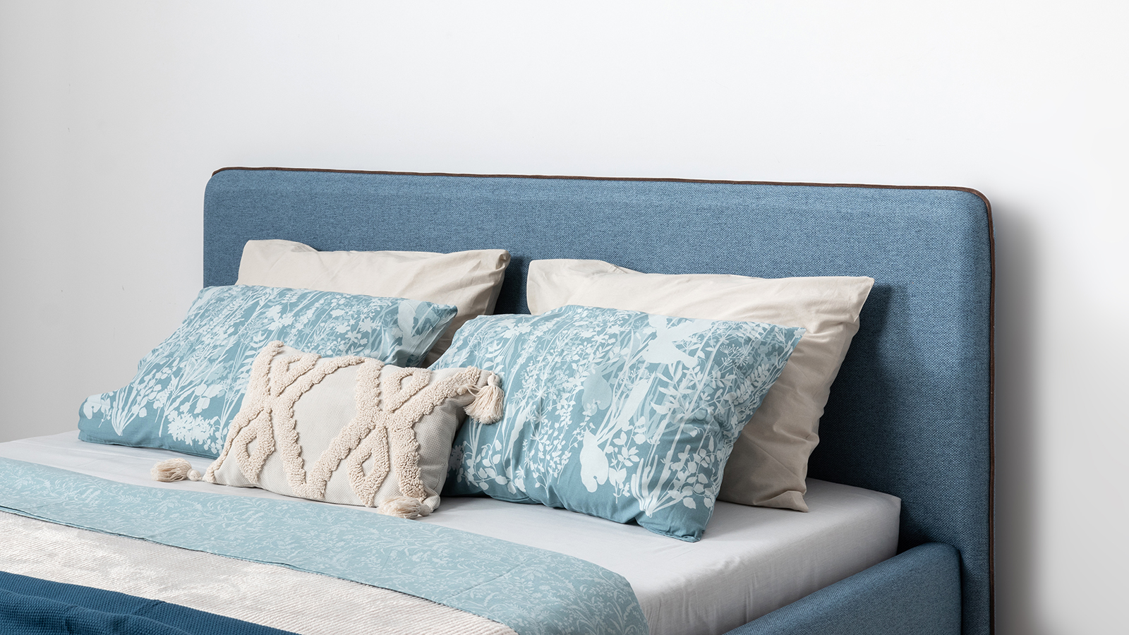 Кровать Миа 160 рогожка светло-синий, кант желтовато-коричневый с ортопедическим основанием и подъемным механизмом