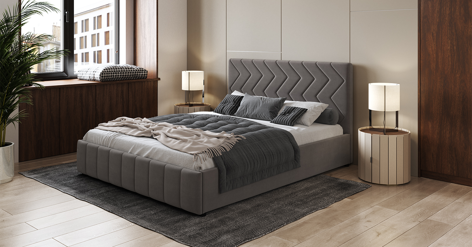 Интерьерная кровать МИЛАНА выполнена в благородном велюре, что подчеркивает объем и геометрию стежки. Выбор сочных цветов обивки делает эту кровать особенно эффектной.