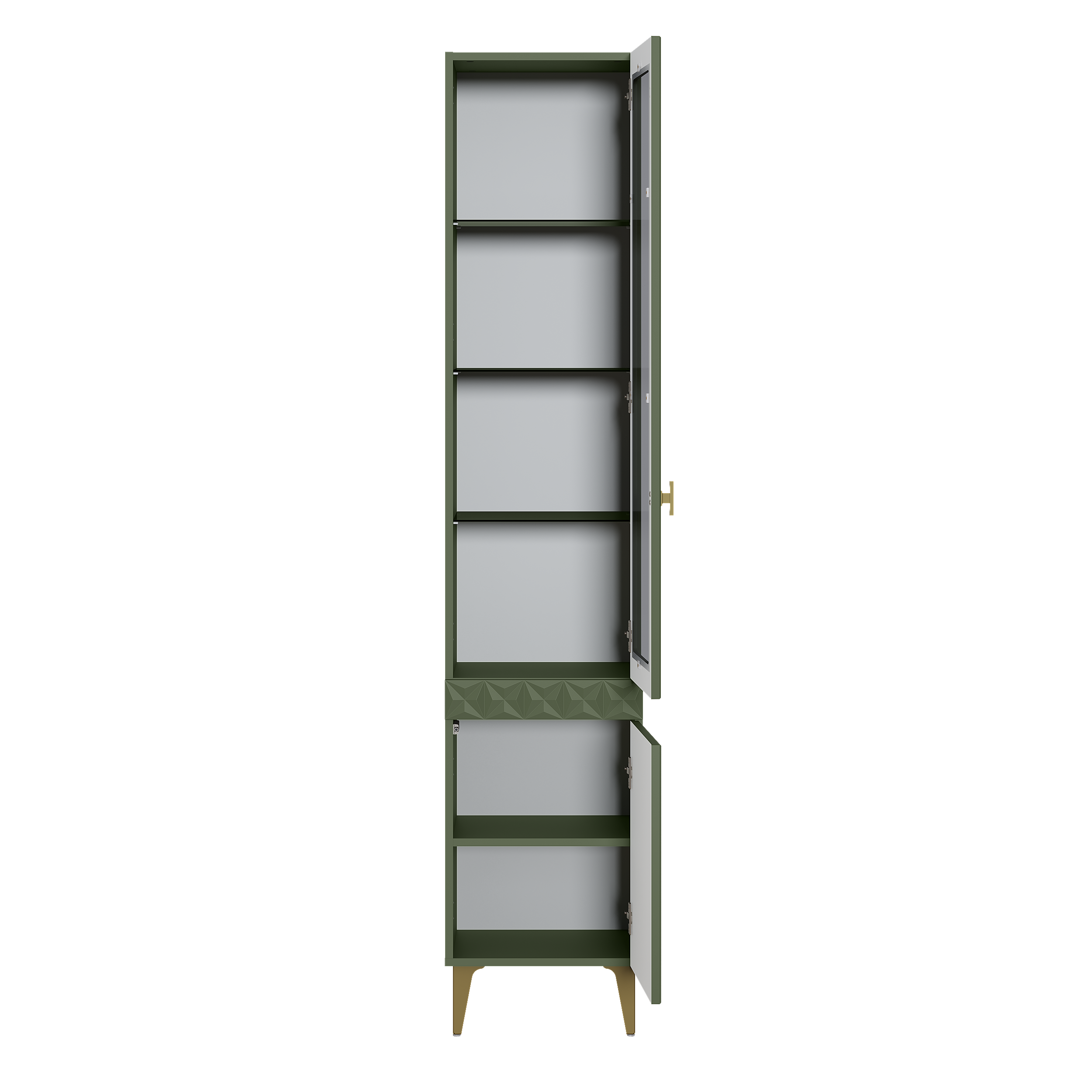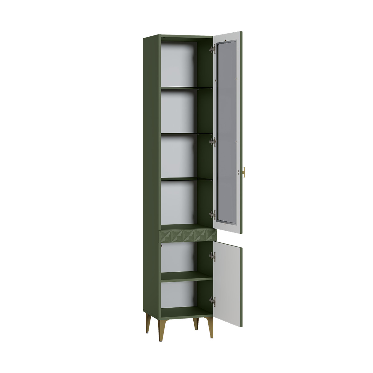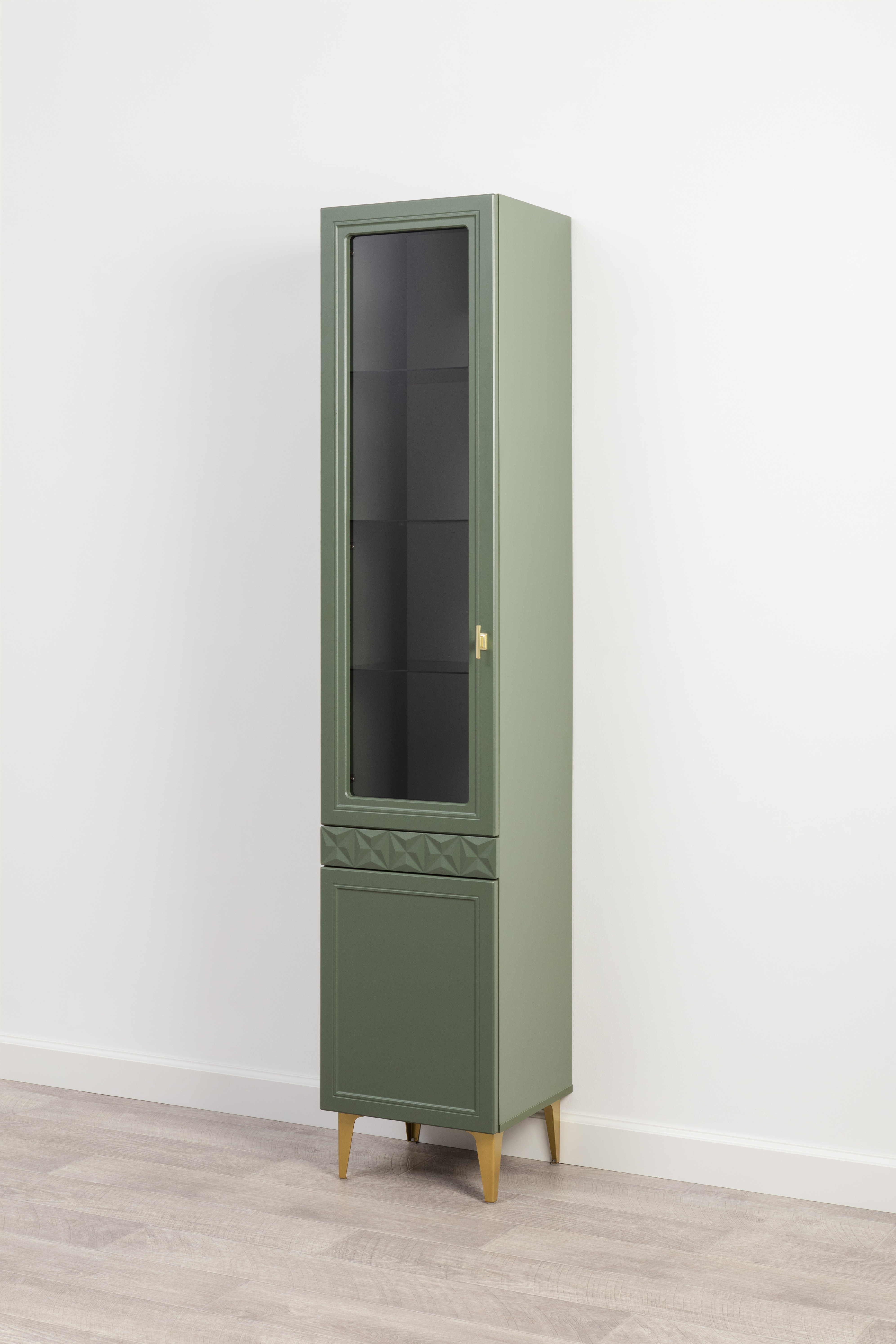 Шкаф-витрина Марион 16.397.01 дымчатый зеленый K521, олива шагрень AG 1050 ПВХ (собирается на любую сторону)