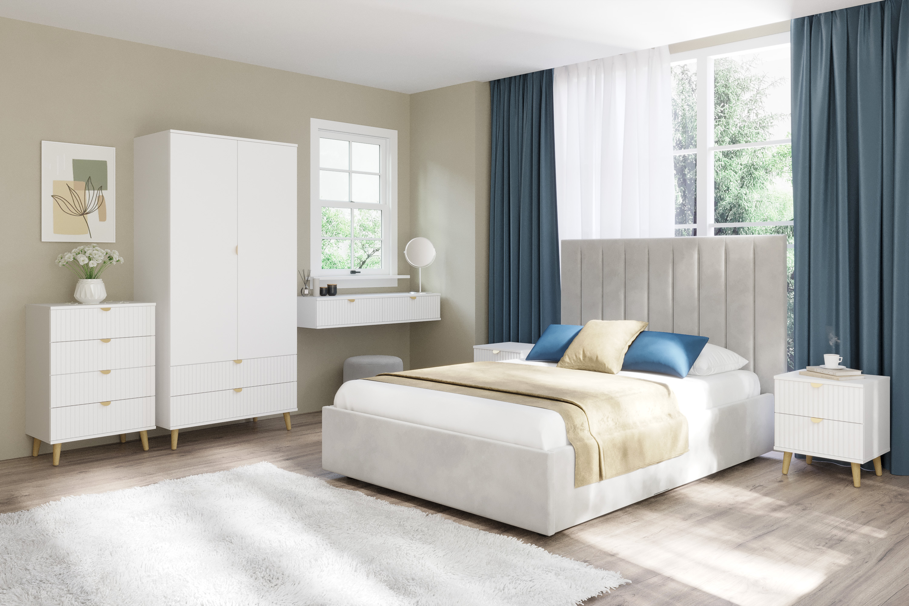 Спальня Дакота композиция 1 меренга, белый, с кроватью Ингрид/Ingrid 1600 велюр ультра смог/ultra smoke, пуф Альба 450 велюр ультра смог/ultra smoke