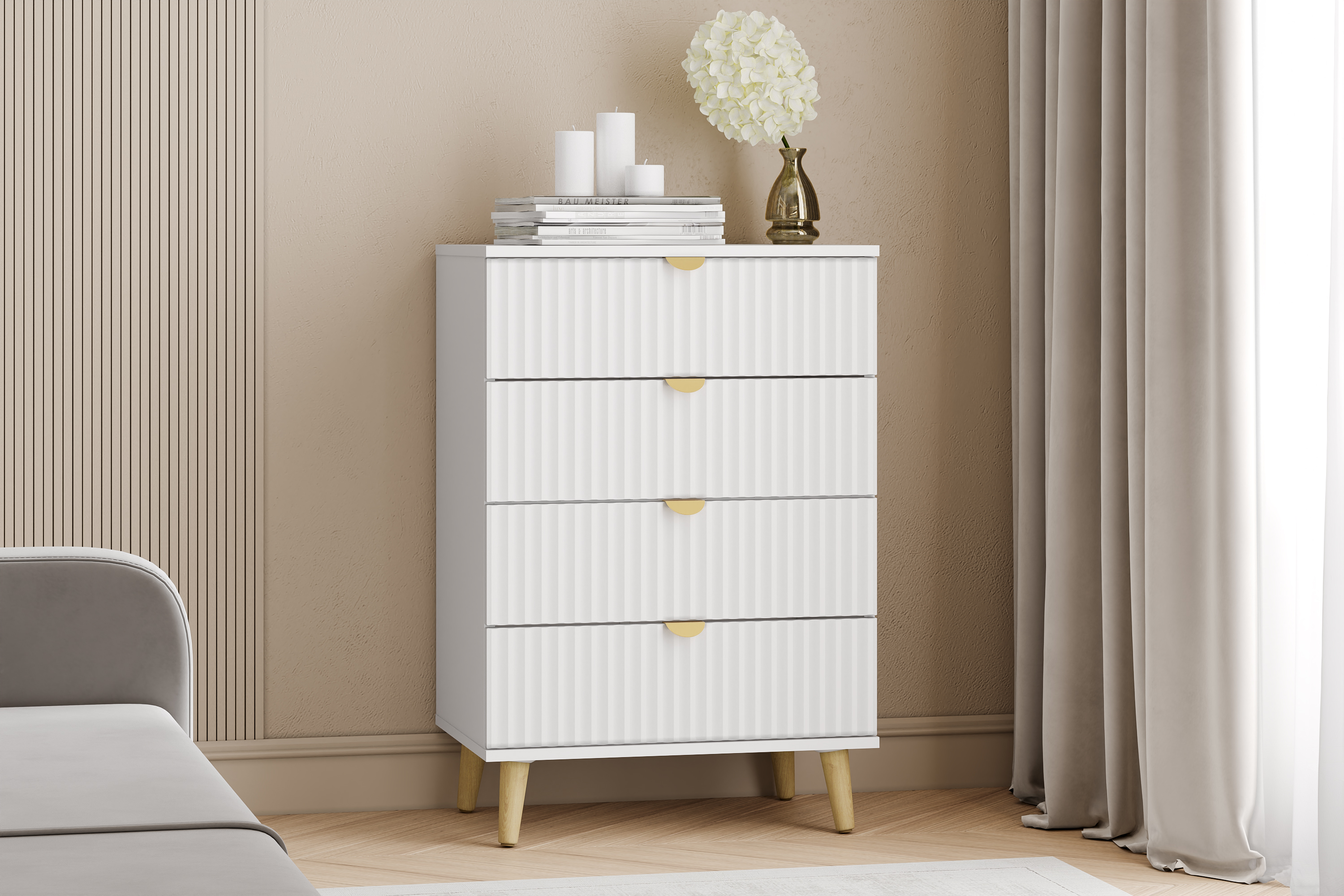 Представляет собой каркас из панелей ЛДСП с четырьмя выдвижными ящиками.