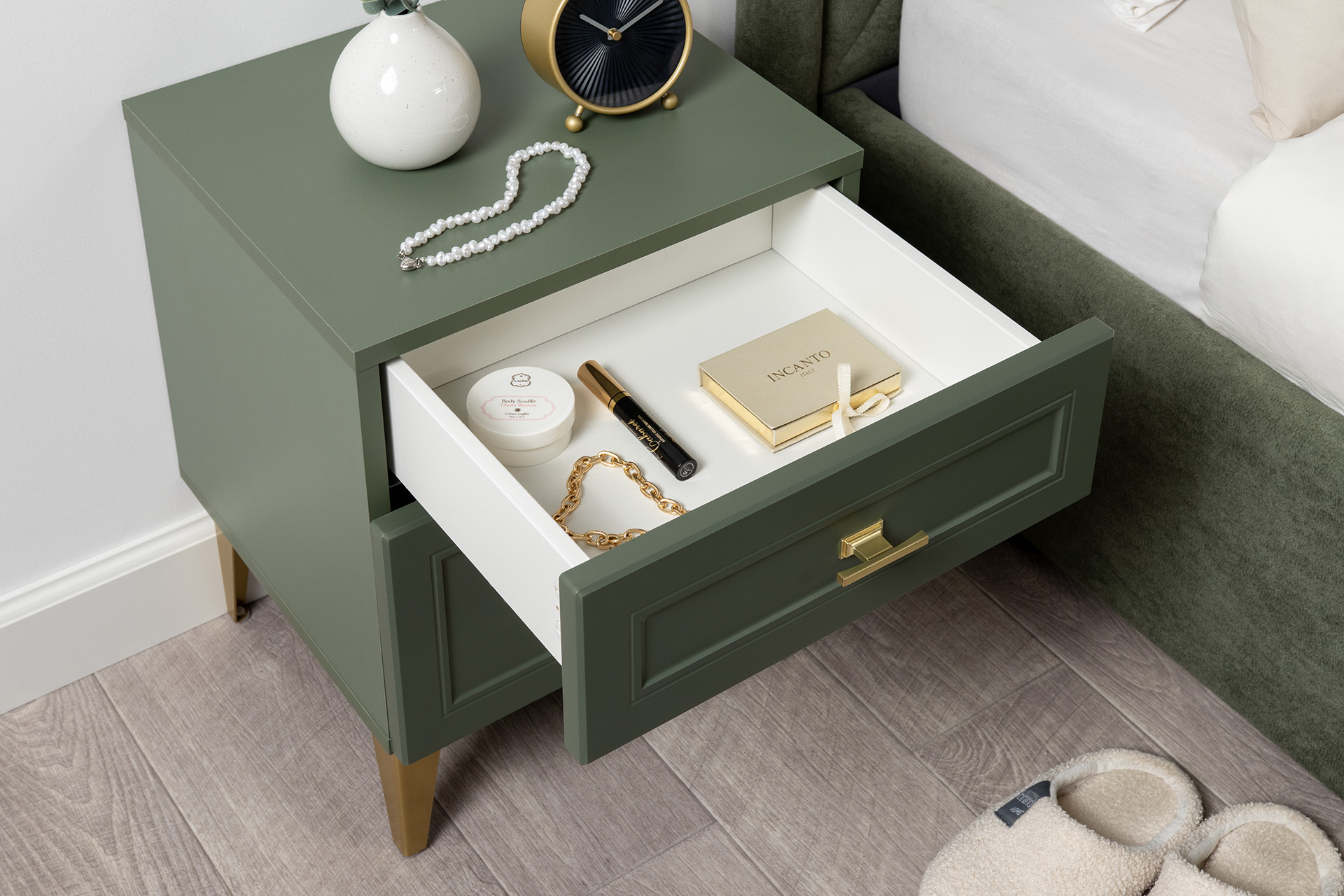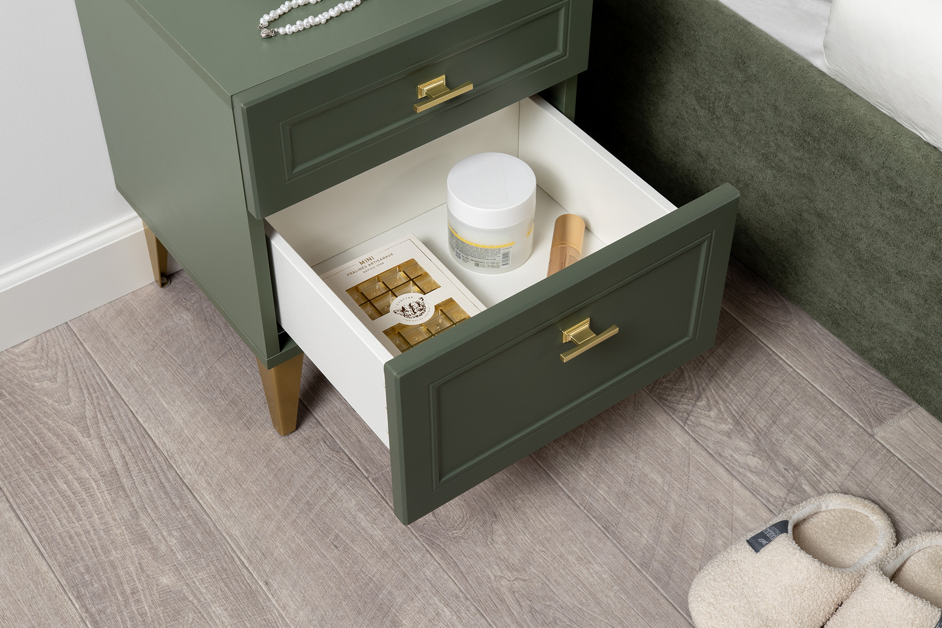 Изящные линии, глубокая фрезеровка фасадов из МДФ и благородные оттенки. Утончённая «Слоновая кость» и изысканная «Олива Шагрень» с глубоким зелёным тоном — создают атмосферу уюта, тепла и благородства. Металлические ручки и опоры золотого цвета придают мебели утончённый блеск, а петли и направляющие с доводчиками обеспечивают плавное и бесшумное закрытие фасадов.